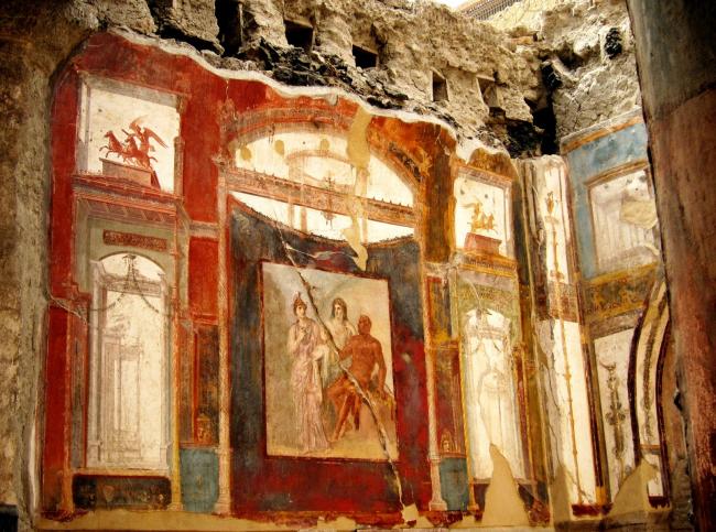 A short distance from Naples, looking out over the gulf of the same name, stands ancient Resina, a small town famous for the important excavations of the Roman city near which it was built. Herculaneum, a somewhat small town and not particularly developed economically and commercially, but however with a flourishing craft trade, was buried like Pompeii by the eruption of Vesuvius in 79 AD. Unlike Pompeii however, Herculaneum was not hit by ashes and lapilli but by a real river of mud, which devastated roads and buildings in the city. Having dried and solidified in time, the mud detritus caused huge damages to the walls of the houses (not found in Pompeii), saving other materials such as wood, and even improving its conservation over the centuries. Excavation work began in Herculaneum in 1738, commissioned by King Charles of Bourbon. In the beginning wells and tunnels were excavated which revealed objects of various kinds, as well as paintings, sculptures and inscriptions. Open-air work began later and revealed the structures of the city, still partly buried in the subsoil of the modern town. The urban layout of the town had a series of roads which in intersected each other at right angles and were adjacent to largely rectangular buildings, at times grouped together in building complexes.